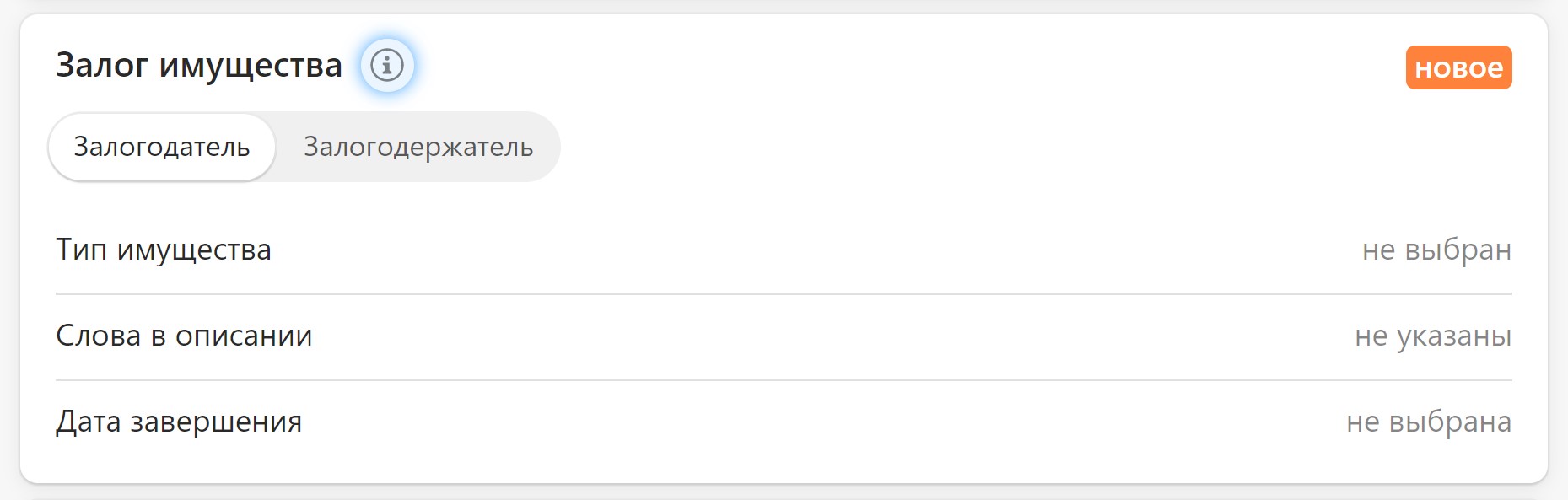 Кнопка 🛈 рядом с названием тематического блока нужна, если пользователь забыл, как пользоваться фильтрами залогов — нажмите на нее, чтобы посмотреть подсказки.