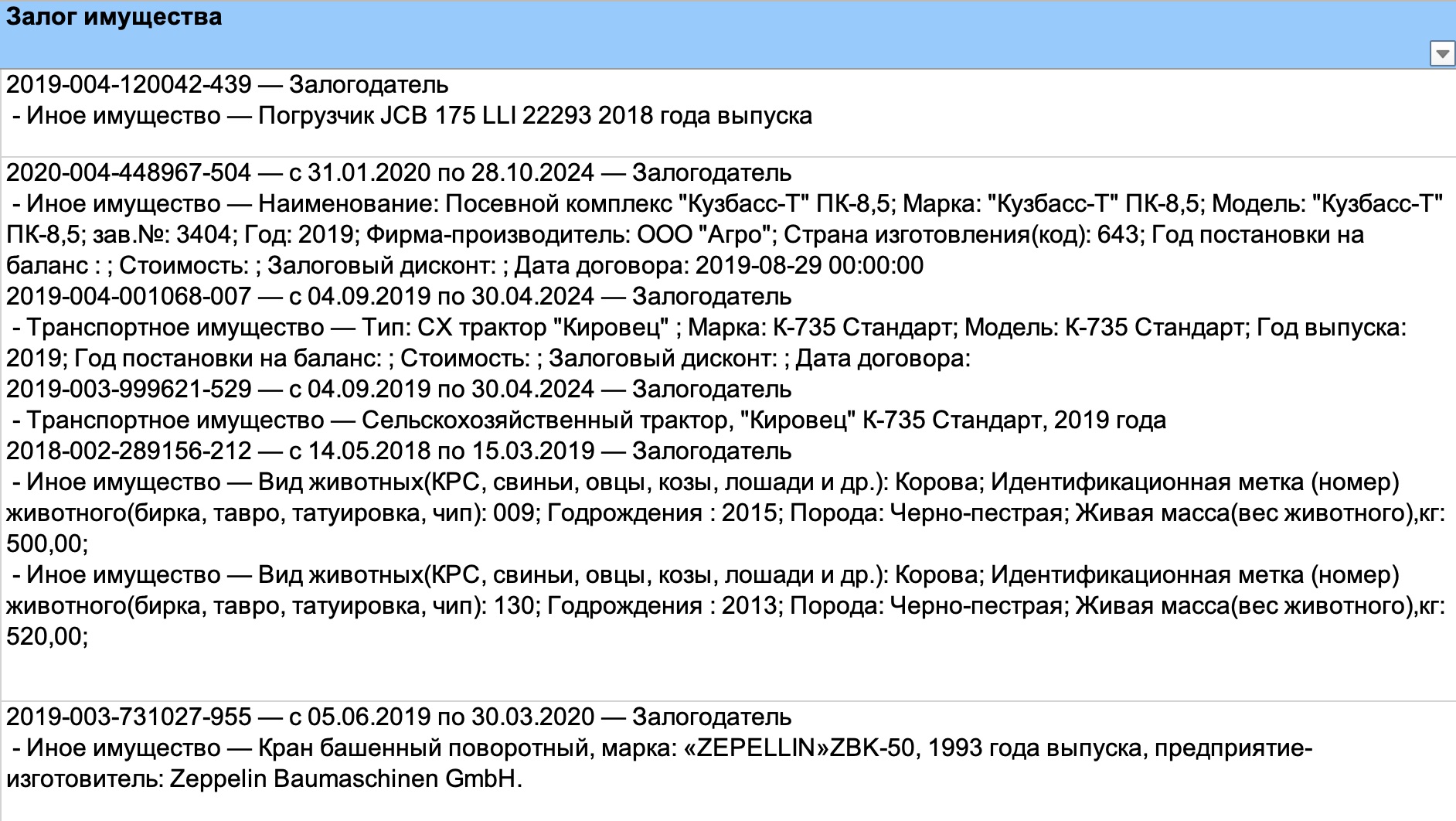 Количество отображаемых залогов одной компании в выгрузке не превышает пяти единиц: этого достаточно, чтобы сделать о компании вывод, при этом ячейка не слишком растягивается.