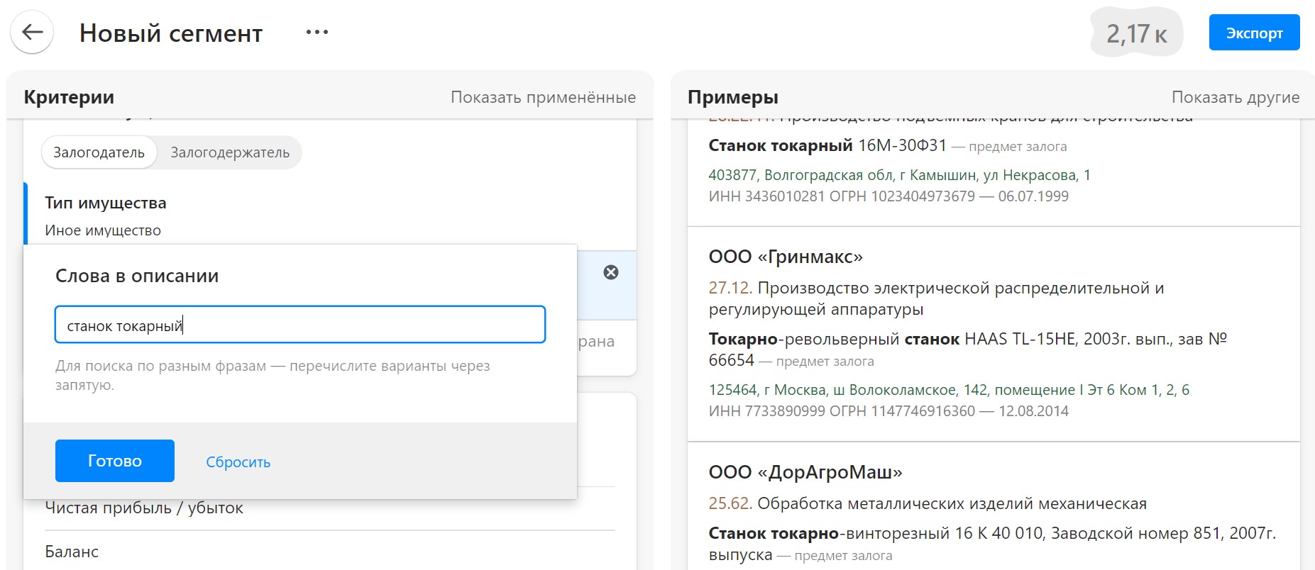 Компании с такими предметами в залоге в Компасе можно найти, указав в фильтре «Тип имущества» категорию «Иное имущество». Пример: по запросу «станок токарный» в категории «Иное имущество» Компас найдёт 2000 компаний.